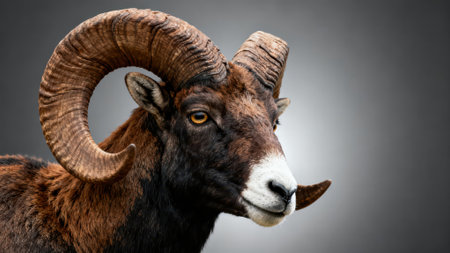 Mouflon Ram Portrait on a gray background with copy space