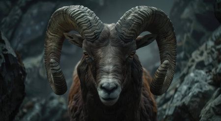 Close-up portrait of a majestic ram showcasing its impressive curved horns and striking features against a dark background, representing wildlife's beauty and strength.