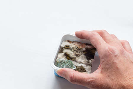 Female hand holds spoiled moldy old piece of food on gray background, close-up, selective focus. Dangerous food