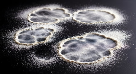 Four cloud shapes are outlined in white flour or powder on a dark, black background. This minimalist and abstract image can represent baking, dreams, or creative concepts.