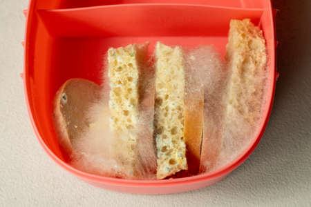 White mold on slices of bread and slices of sausage in pink lunch bokeh. Spoiled bad food in mold.
