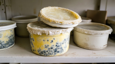 Close-up view of old fermentation jars displaying mold growth, set on rustic shelves. A glimpse into food preservation techniques and microbial cultures.