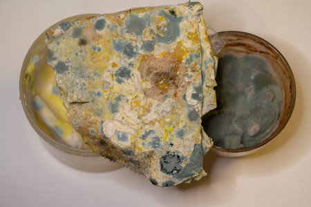 Close-up of moldy fungus on food. Fluffy spores mold as texture. Moldy, spoiled food.