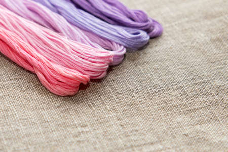 Set for embroidery. Embroidery thread shades of violet and pink color on linen homespun cloth. Coloring and processing photos. Shallow depth of field.