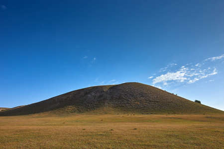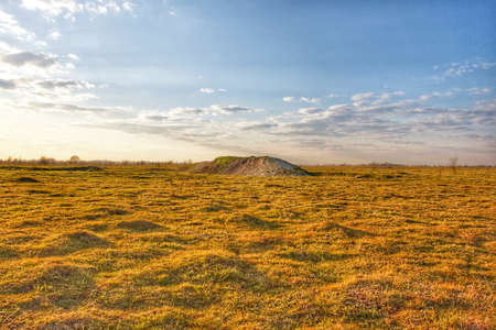 Hill in the field. Yellowed grass. Evening sky over the field.