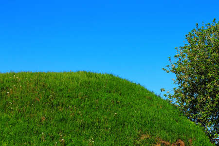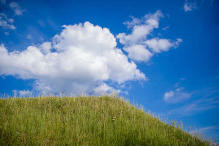 Green grass hill and blue sky with clouds at sunset. Nature background