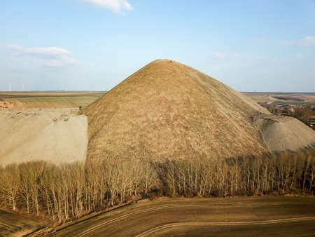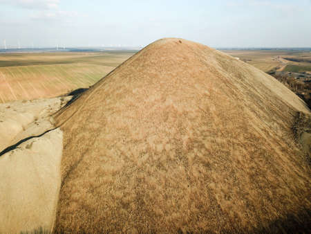 an aerial view of an ancient mound in a desert, captured in the style of grungy textures and influenced by the dusseldorf school of photography. this atmospheric installation showcases dynamic outdoor shots with a melting pot of dark beige tones. the depth of field adds a captivating touch to this mesmerizing image. ai generated