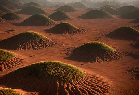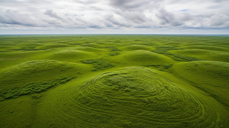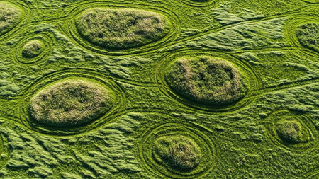 Landscape showing aerial view of a lush green field with distinct oval-shaped mounds and swirling patterns created by grass growth and wind erosion forming a...