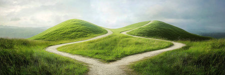 Discover a tranquil landscape of rolling green hills under a cloudy sky, creating a serene atmosphere perfect for relaxation, contemplation, and nature appreciation.
