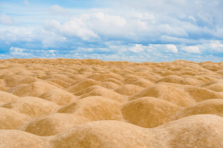 A stunning view of mounds of raw soil and dirt on a graded landscape. The natural light reveals textures and shapes, showcasing the rugged earth in an industrial setting.