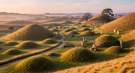 A beautiful, misty sunrise illuminates a vast, ancient landscape of rolling green hills dotted with Neolithic burial mounds (tumuli) and megalithic standing stones. This historical site, possibly in Ireland or the UK, evokes a sense of mystery, history, and sacredness.