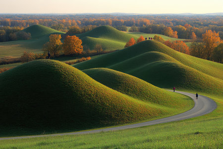 High-angle view of a winding road through a landscape of sculpted, grassy hills. Fall colors accent the scene, while people are visible along the path.