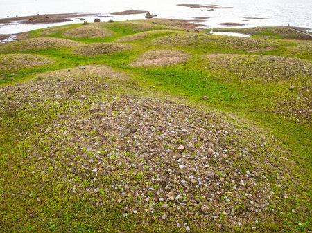 Rocks in the grasslands of the Khlong Din Daeng reservoir during the rainy season