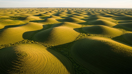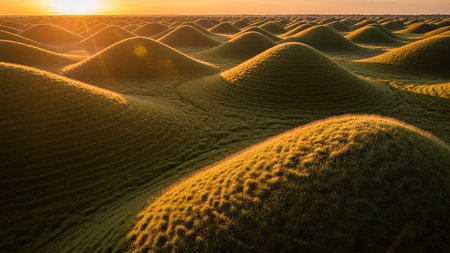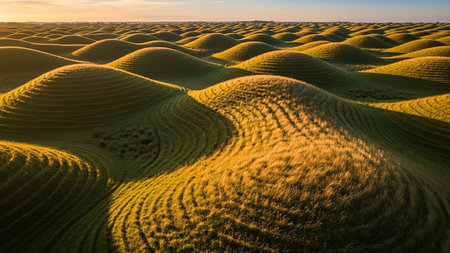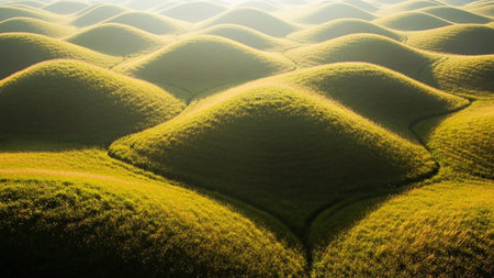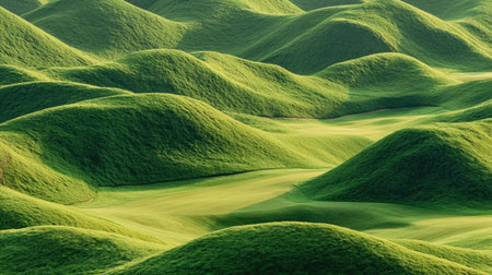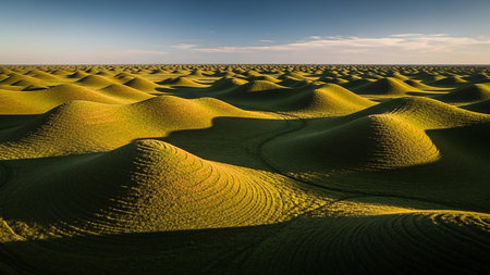 Natural showing rolling green grassy hills with perfectly spaced rounded mounds casting shadows under a clear blue sky with a distant horizon keywords: green,...
