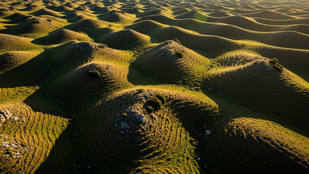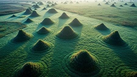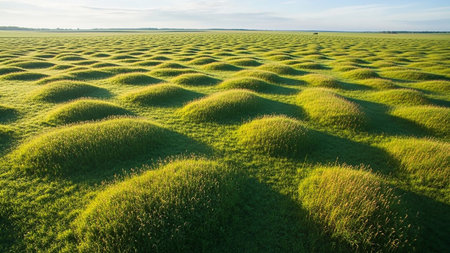 Parks/ showing aerial view of a lush green meadow with numerous oval-shaped grassy mounds creating a unique patterned landscape keywords: green meadow, grassy...
