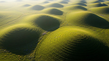 Aerial view of vibrant green rolling hills with distinct concentric circular patterns carved into the earth, bathed in soft light under a hazy sky.