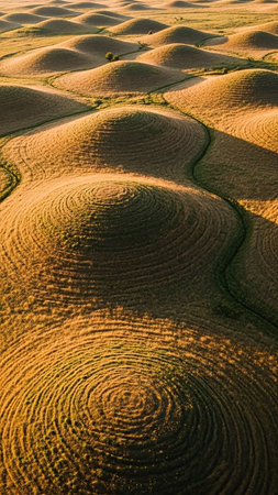 An aerial perspective of gently rolling hills covered in dry, golden grass, featuring distinct circular patterns and winding paths illuminated by warm sunlight.