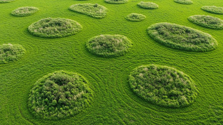 Perfectly showing expansive green grassy field with perfectly manicured circular mounds of grass and concentric ring patterns viewed from an aerial perspective...