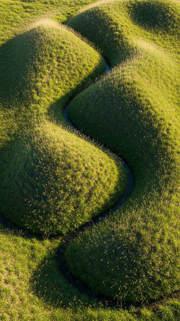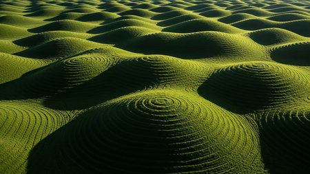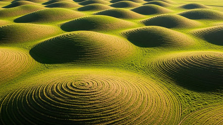 Overhead view of rounded grassy mounds and concentric circular patterns etched into a bright green field, bathed in sunlight creating subtle shadows and textures.