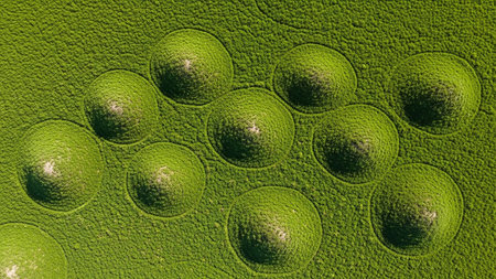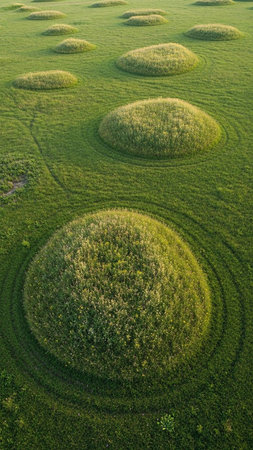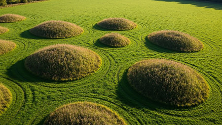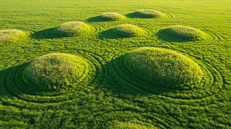 An aerial perspective of a vibrant green field featuring several distinct circular grass mounds with concentric rings, illuminated by sunlight casting shadows.