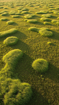 Circular mounds of tall grass create a unique, patterned landscape in a vibrant green field with subtle concentric rings.