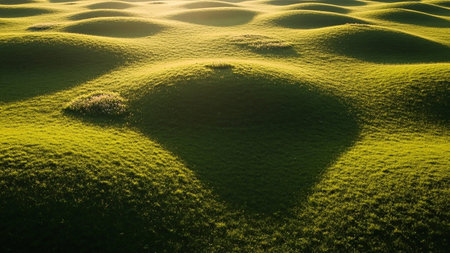 With showing close-up view of undulating green hills with textured grass illuminated by warm golden hour sunlight creating dramatic shadows and highlighting the...