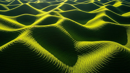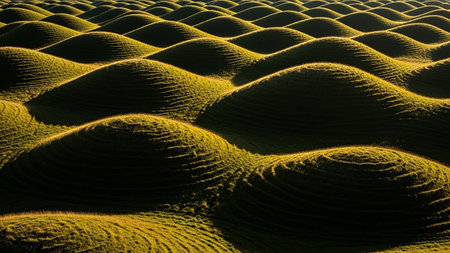 Landscape showing rolling green hills with rippling textures and shadows cast by the setting sun creating a surreal undulating landscape pattern keywords: rolling...