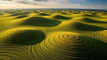 Aerial drone reveals unique undulating patterns of cultivated green fields forming circular and spiral shapes under warm golden hour sunlight.