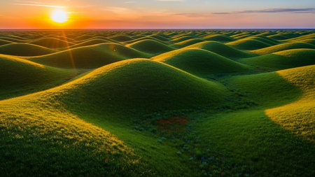 With showing expansive view of undulating green hills under a golden sunset sky with textured grass and winding paths evoking a sense of vastness and natural...