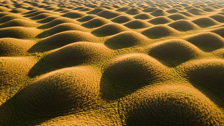 Aerial drone view of golden grassy hills with undulating mounds and deep shadows, showcasing a textured natural landscape pattern under warm sunlight.
