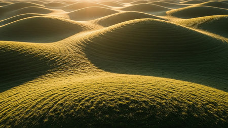 Undulating grassy mounds bathed in warm golden hour sunlight, casting long shadows and creating a textured, serene landscape.