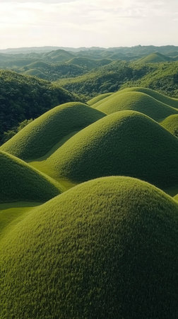 Expansive showing undulating green hills covered in lush grass under a cloudy sky, showcasing natural contours and patterns keywords: green hills, undulating hills,...