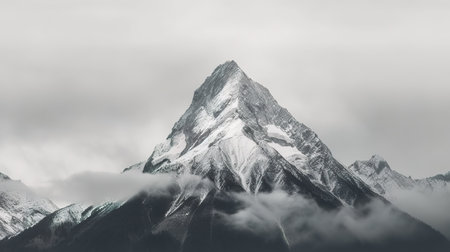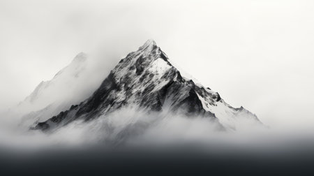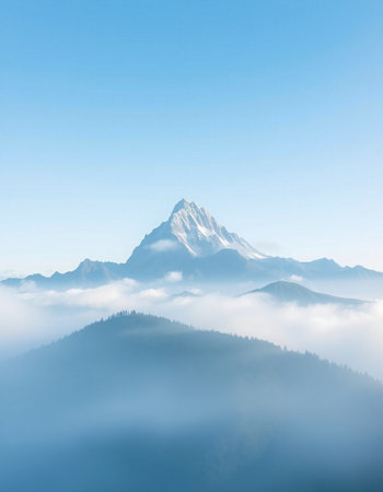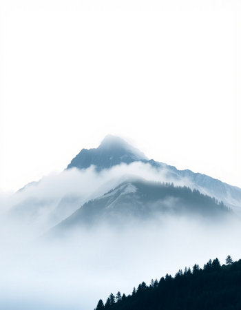 A stunning view of a solitary mountain peak enveloped in mist and fog. The serene landscape embodies tranquility, making it perfect for nature enthusiasts and wanderers.