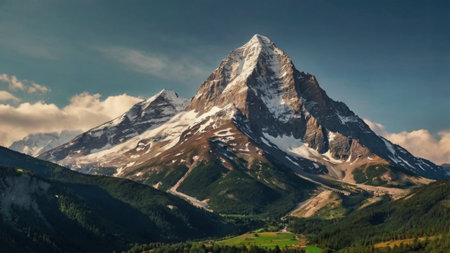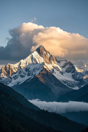 Beautiful mountain landscape with snow-capped peaks in the clouds