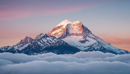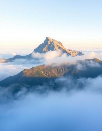 Misty mountain peak surrounded by clouds, serene atmosphere. Nature and tranquility concept