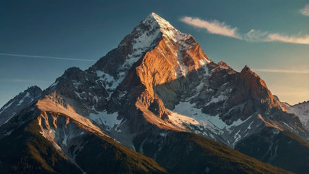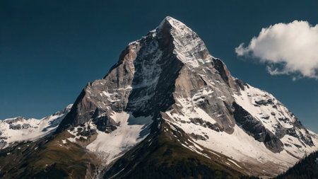 Minimal mountain landscape with black peaked top with white snow under blue sky. Snow-covered pointy peak in sunlight. Atmospheric mountain scenery with peaked top in sunshine. Awesome mountain top.