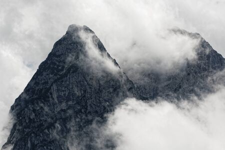 Mountain peak in clouds. Caucasus Mountains, Georgia, region Gudauri.