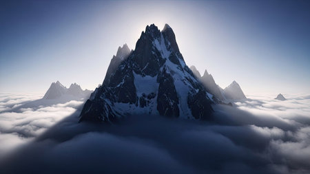 Minimal mountain landscape with black peaked top with white snow under blue sky. Snow-covered pointy peak in sunlight. Atmospheric mountain scenery with peaked top in sunshine. Awesome mountain top.