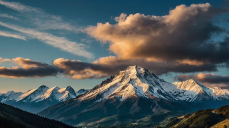 Beautiful mountain landscape with snow-capped peaks at sunset.