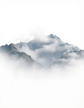 Snowy mountain isolated on white background. Snow covered mountain peak.