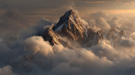 Beautiful alpine mountain landscape with snow covered peaks in the clouds