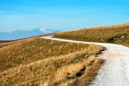 Dirt road and pastures. Plateau of Lessinia, Regional Natural Park of Lessinia, Veneto, Verona, Italy and mountain range of the Adamello Brenta