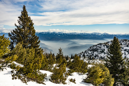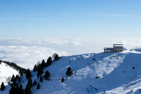 horizon of the Venetian plain immersed in clouds between fog and snow with snowy trees and snowy Alpine peaks on a winter day in Recoaro Mille, Vicenza, Italy