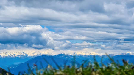 Mountain peak of Hahnkogel (Klek) with panoramic view in spring on the Karawanks, Carinthia, Austria. Borders Austria, Slovenia, Italy. Triglav National Park. Alpine meadows. High grass