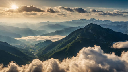 Aerial view of the mountains covered with clouds at sunset. Beautiful summer landscape.