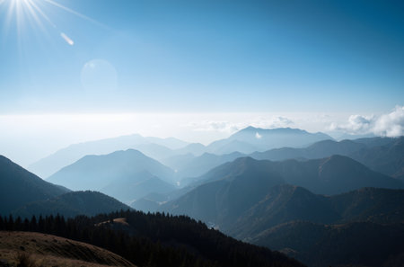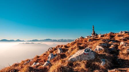 the peaks of the Alps around Lake Garda surrounded by fog with blue sky seen from Monte Altissimo, Trento, Italy