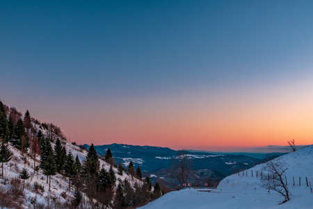 Sunset in the hills between Slovenia and Italy in a freezing winter day