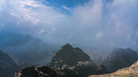 Panoramic view from the West Peak summit of the inspiring, sacred and majestic Huashan mountain, famous tourist attraction, Shaanxi province, China