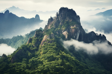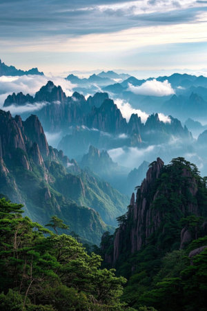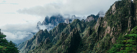 A panoramic shot of the mountains of Huangshan in China under a foggy sky