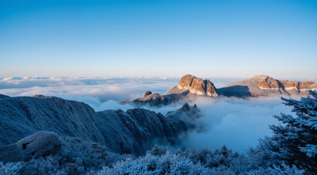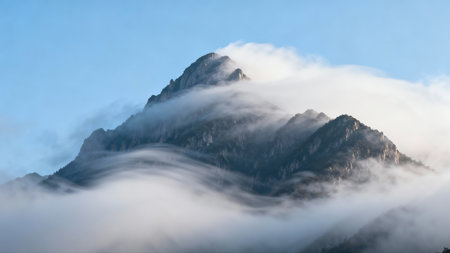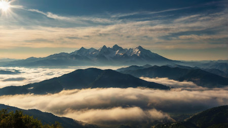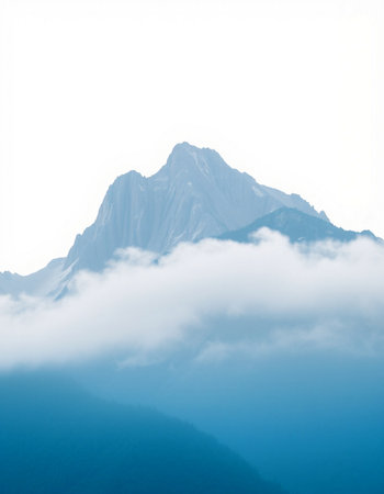 Experience the beauty of a serene mountain landscape with rolling clouds, showcasing majestic peaks under a clear blue sky. Perfect for nature enthusiasts and explorers.
